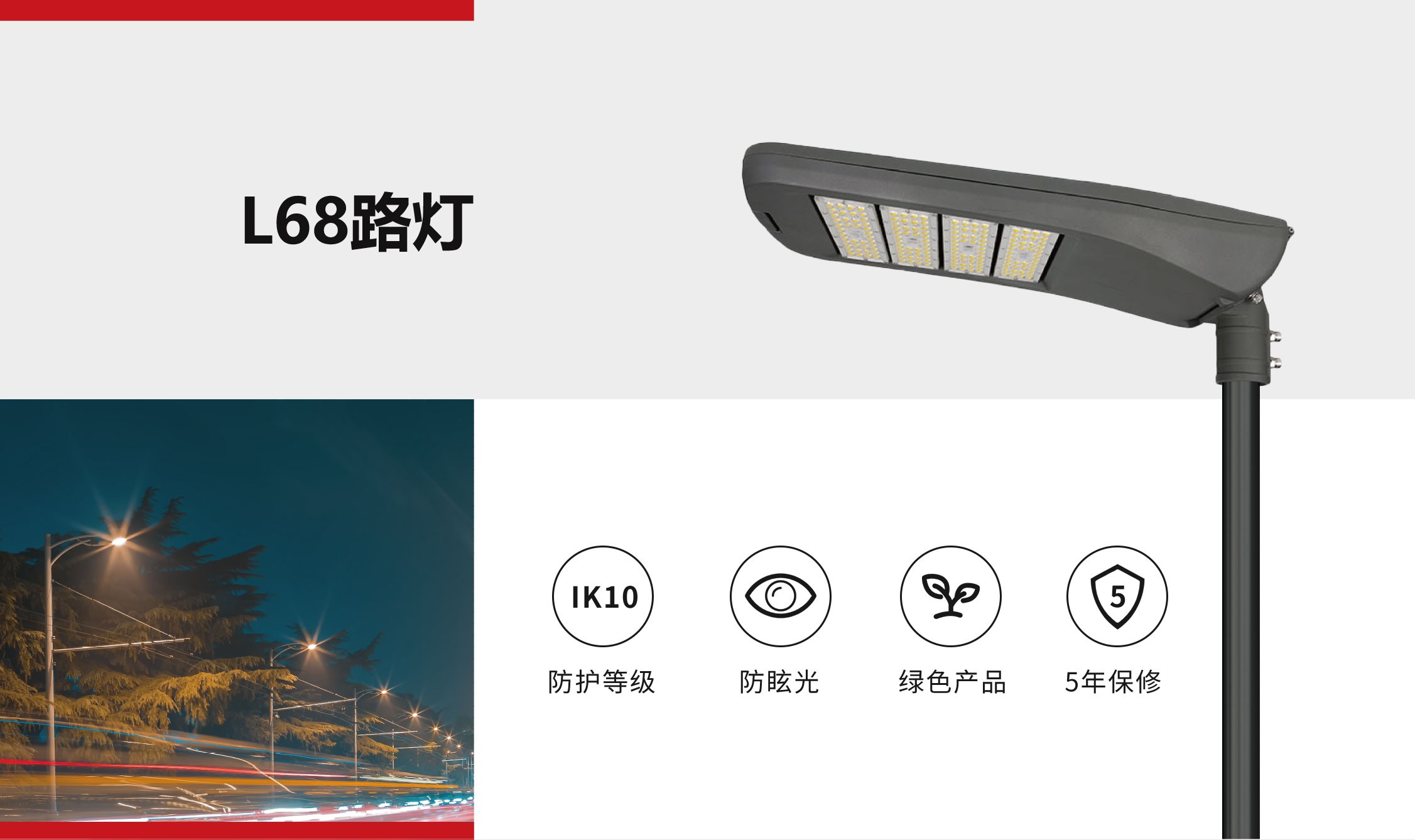 L68路灯外形美观大方(外观专利号ZL202130491892.0),采用了全新的LED照明技术,透镜透光率高达98%,整灯发光效率高达180lm/W,性能稳定,功率50-300W可选,适用于各类道路和广场。