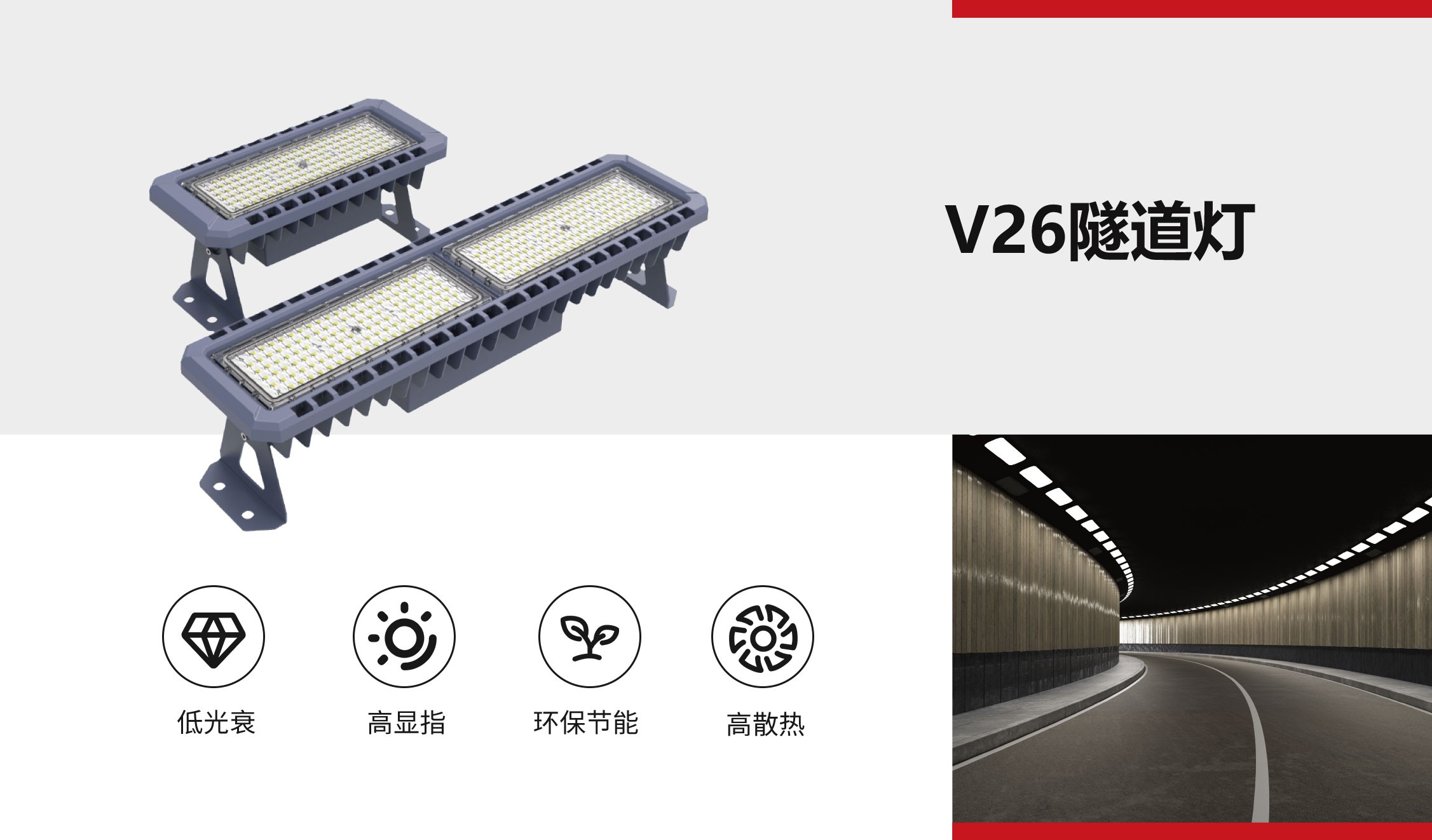 V26是一款专业隧道灯,整灯光效高达150lm/W,达到IP66和IK10防护等级,功率范围30W-200W可选,且经过专业光学设计和隧道照明配光,能够让行车人员在隧道中感受到更加清晰、舒适的照明体验,是隧道照明的理想产品。