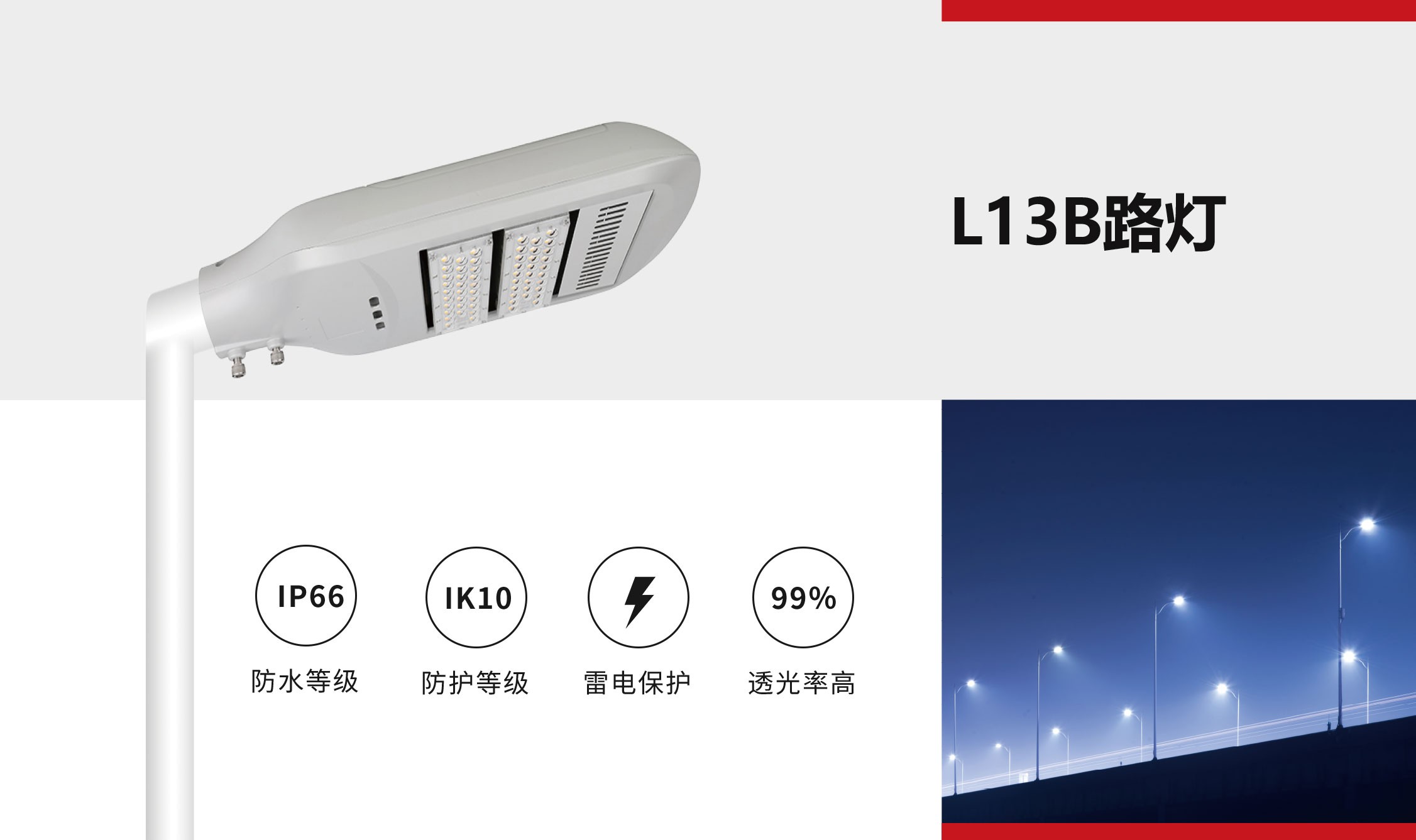 L13B路灯采用精准的二次光学配光设计,多种配光方案可选,且支持定制化配光设计;L13B采用高效率恒流驱动,节能60%,此外,采用模块化结构设计,易于组装、安装和升级维护,可有效降低管理成本。