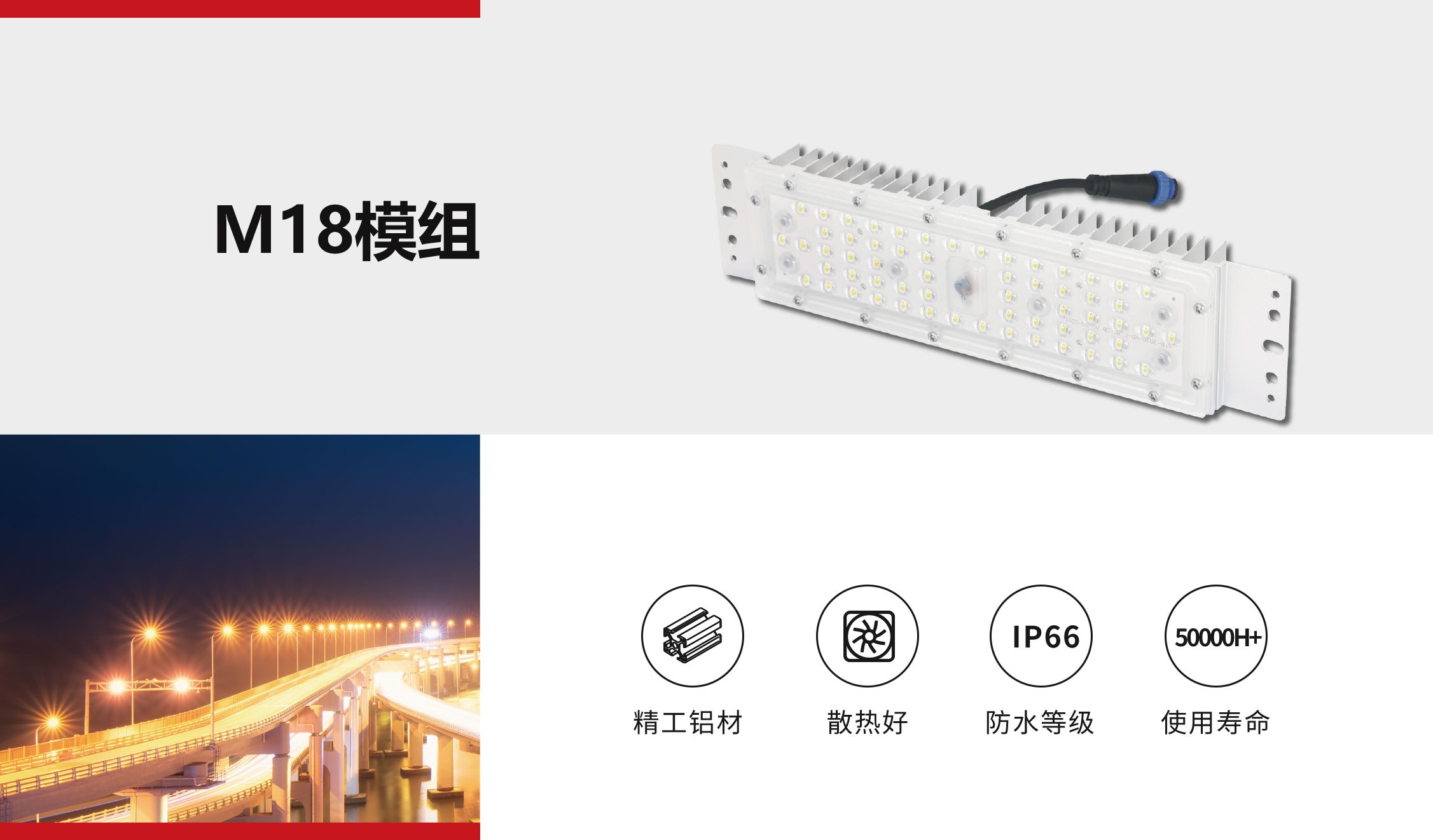 M18模组精选高品质LED芯片,采用多晶封装,光效高、性能稳定,低光衰,无死灯。通过超高阶自由曲面或鳞片反射设计,进一步提升亮度和照度均匀性以及几何利用率。