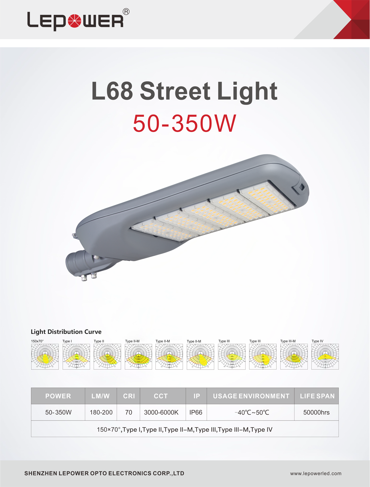 LED路灯系列,道路照明标杆。L68路灯产品采用多芯片封装5050 LED光源,寿命超50,000小时,减少频繁维护成本。百叶窗式散热设计搭配高压压铸铝合金外壳,避免灰尘堆积,确保产品稳定运行,适应沙尘暴等恶劣天气。支持支持-10°至15°安装角度调节,可选配智控系统,实现远程调光与故障预警。