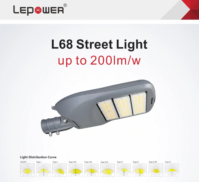 L68B路灯采用多芯片封装5050光源与精准配光技术,透镜透光率高达98%,整灯发光效率突破180lm/W。高压压铸铝合金外壳与百叶窗散热设计,确保50000小时超长寿命。同时支持Type I-V型透镜定制,适配高速公路、城市主干道、隧道等多元场景。