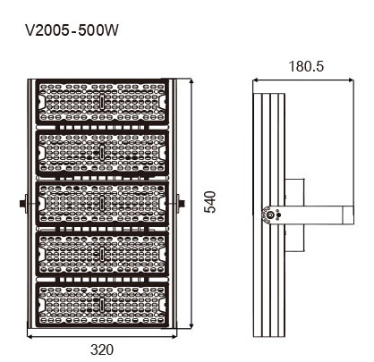 LED球场灯V20采用高压压铸铝合金外壳设计,坚固耐用,光束角度-90~180°可调,适用于不同照明场景,功率范围100W ~ 500W,适用于各种运动场地及区域照明。