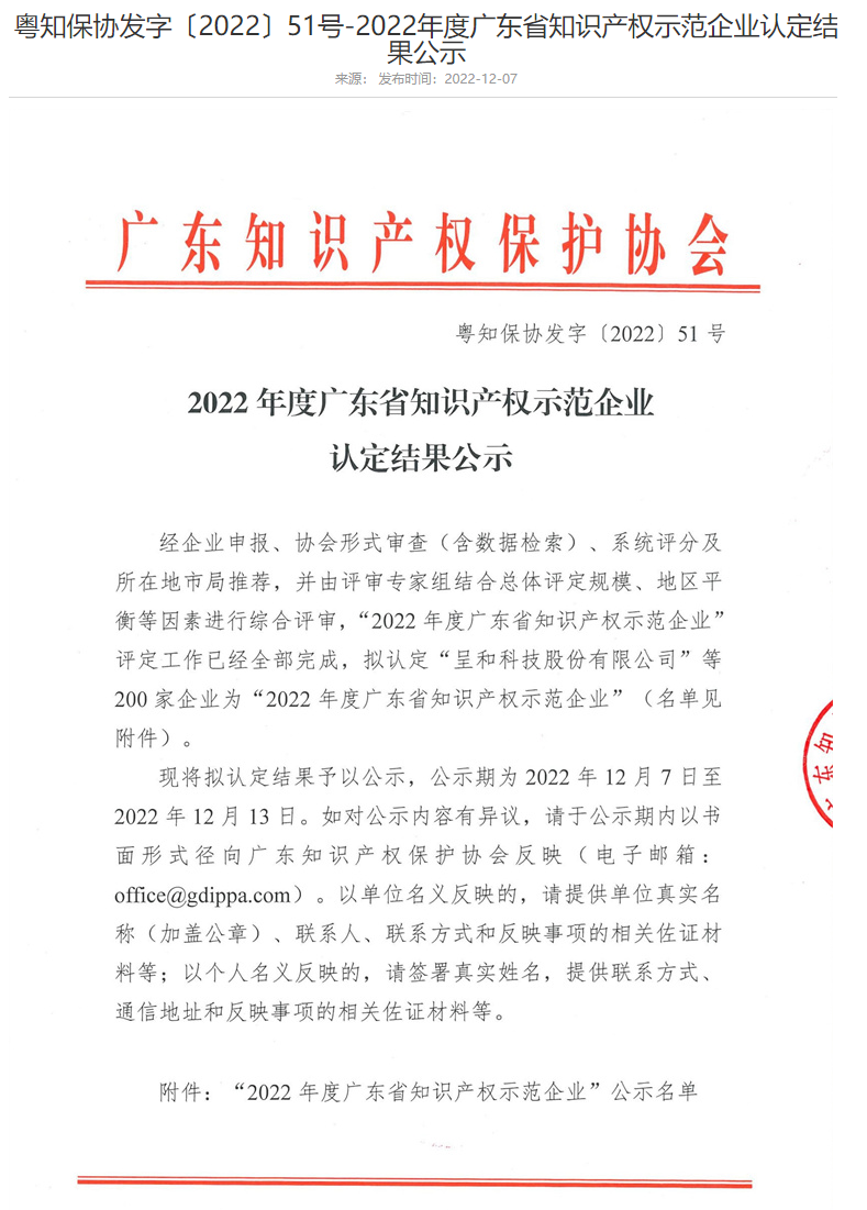 日前,广东知识产权保护协会发布了《2022年度广东省知识产权示范企业认定结果公示评定结果》。经企业申报、协会形式审查(含数据检索)、系统评分及所在地市局推荐,并由评审专家组织结合总体评定规模、地区平衡等因素进行综合评审。