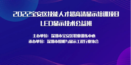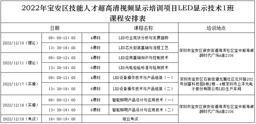 此次“培训项目”由“深圳市宝安区职业训练中心”主办和“深圳市照明与显示工程行业协会”承办。课程大纲为“LED行业现状分析与发展趋势、LED芯片封装基础与流程工艺、LED应用基础知识与控制技术、LED光电检验标准与检测技术、LED设备操作技术与产品组装、智能照明设计与应用实践”。
