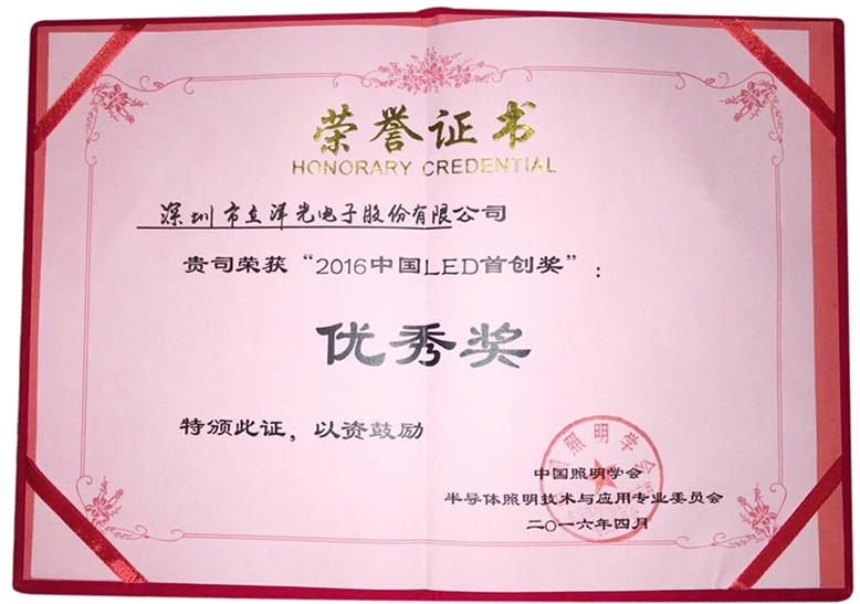 2016年4月15日,由中国照明学会、CSA联合指导,中国照明学会半导体照明技术与应用专业委员会主办的“中国LED首创奖” 在北京隆重举行。大会一直以来以寻找中国LED诺贝尔为主题,表彰在推动LED自主创新方面具有突出贡献的企业和个人。