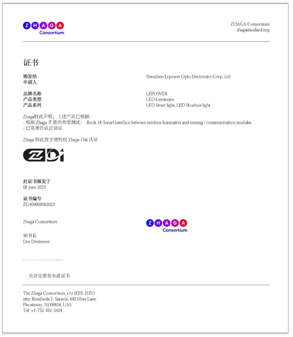 立洋光电产品LED路灯L29系列和LED鞋盒灯系列通过了Zhaga组织的测试和评定,获得 Zhaga-D4i 认证,产品标签上获准印制 Zhaga-D4i 认证标志,这也标志着立洋光电的技术实力和产品质量再上新台阶。