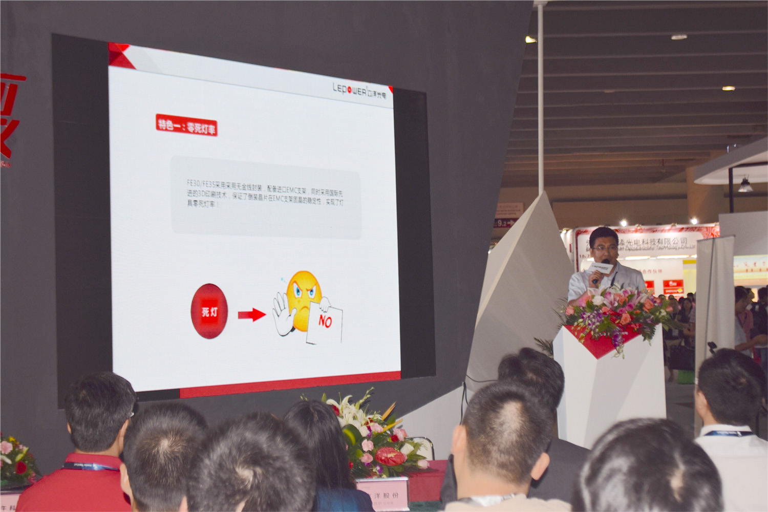 接着进行的是此次会议的新品发布环节,由立洋股份技术中心高级工程师刘飞宇主持。刘工从产品结构设计、质量标准、检测体系、应用市场等方面详细介绍了公司新品——倒装EMCF FE30/FE35系列和倒装集成COB系列,目前立洋股份倒装系列产品在户外照明、特种照明如汽车灯和舞台灯等领域得到了广泛应用。