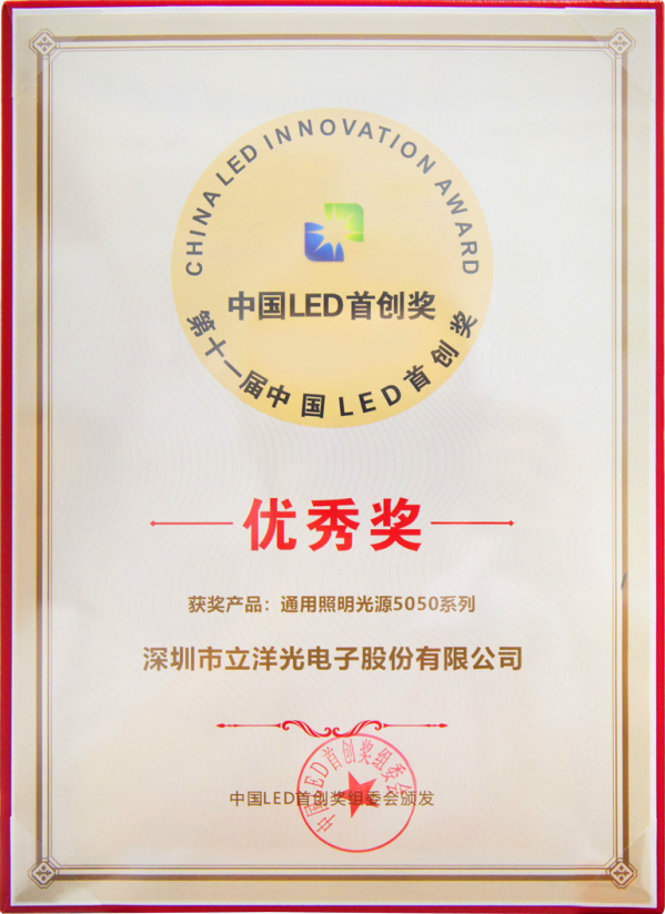 在这场汇聚了行业精英、专家学者和业界创新企业的盛会上,立洋光电“通用照明光源5050系列”凭借卓越的封装技术和产品创新,在LED封装产品类别奖项评审中荣获“中国LED首创优秀奖”。这一成就的取得不仅彰显了立洋光电在LED封装领域的领先地位,也为中国LED产业的发展注入了新的活力。