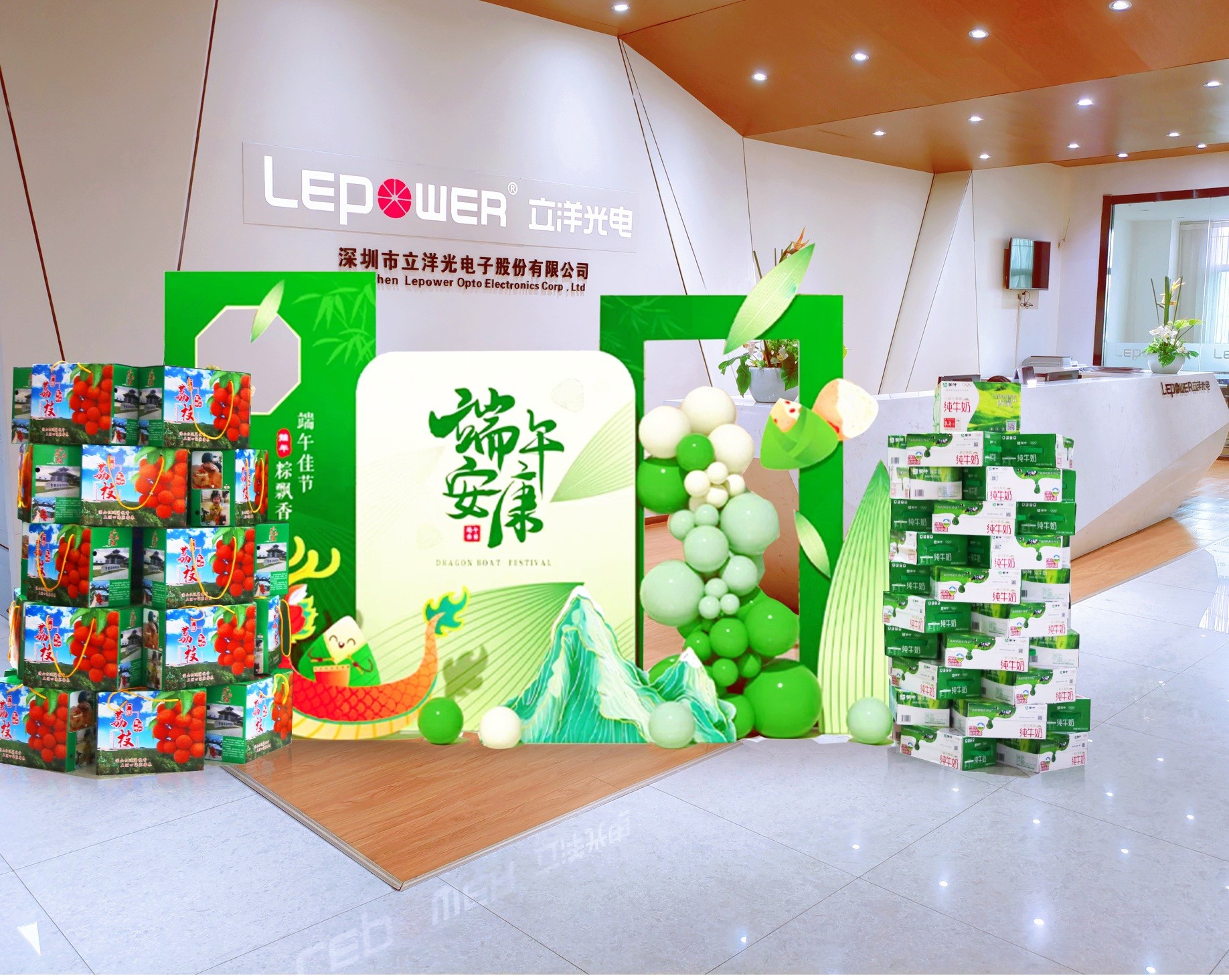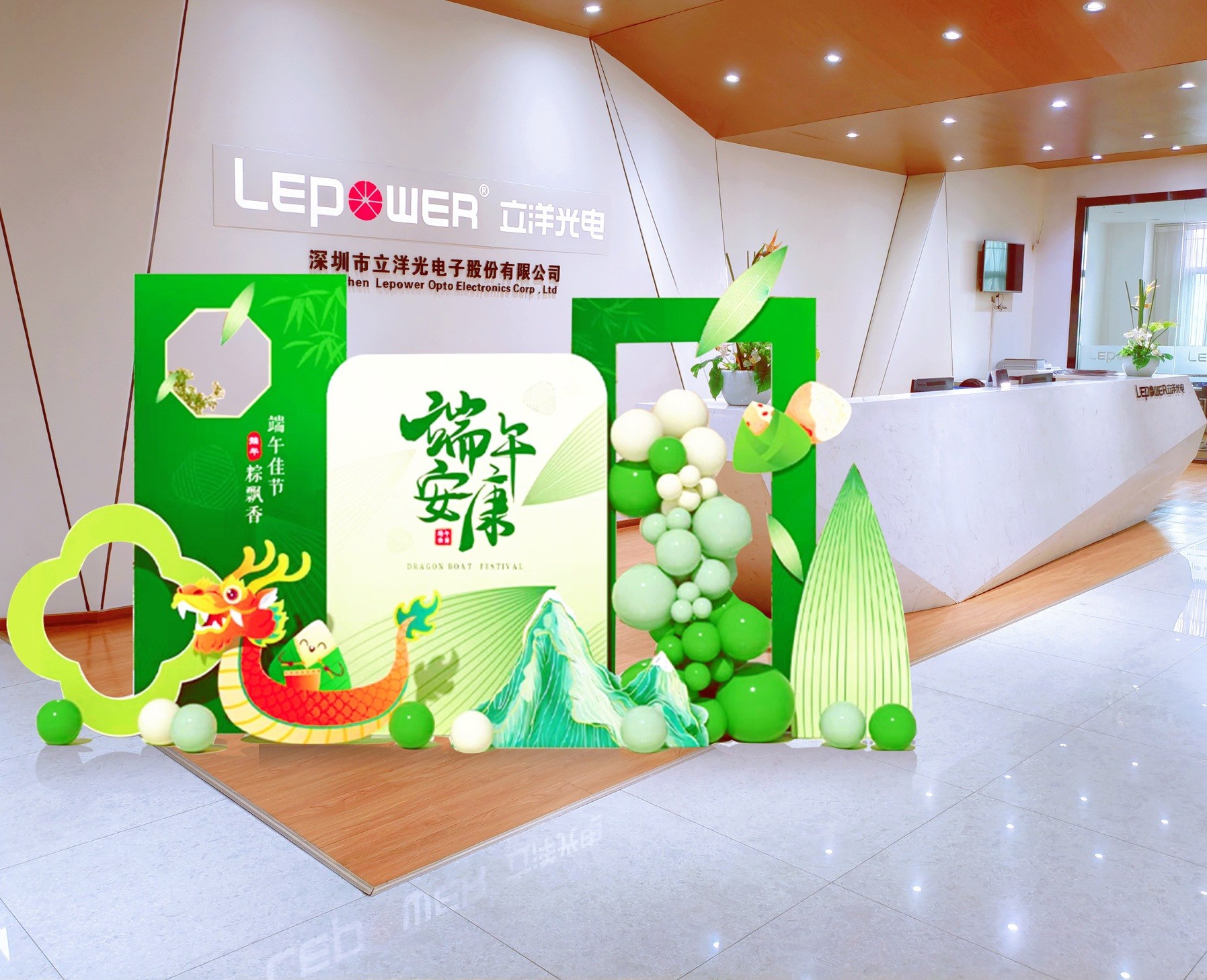 活动当天,公司打造了充满节日气息的主题场景,前台背景布置了端午立体装饰,龙舟模型栩栩如生,仿佛即将在碧波中破浪前行,寓意着公司在激烈的市场竞争中勇往直前、奋勇争先。这一精心布置的端午主题前台场景,让立洋人感受到了浓厚的节日氛围,更深入了解这一传统节日的文化内涵。