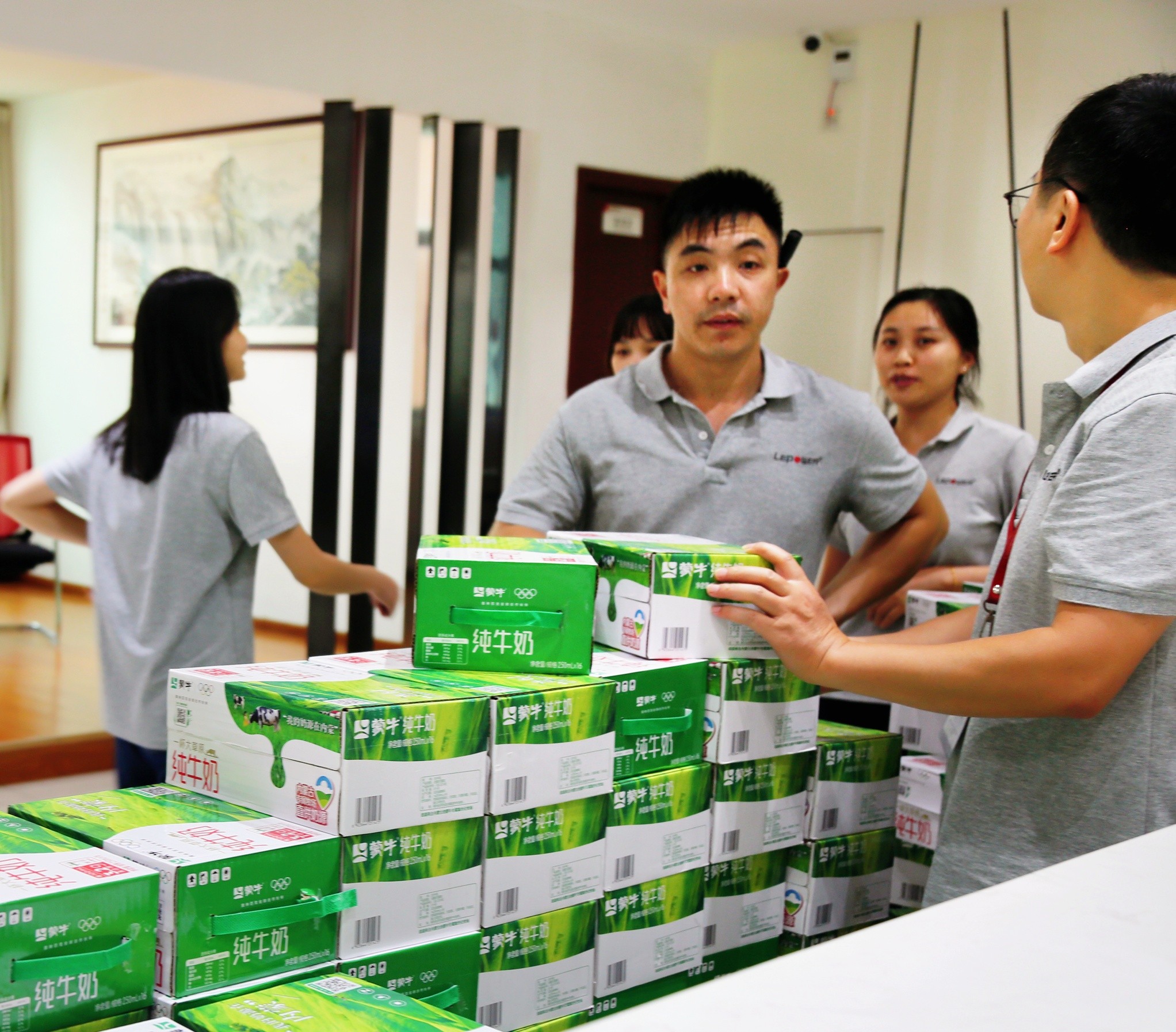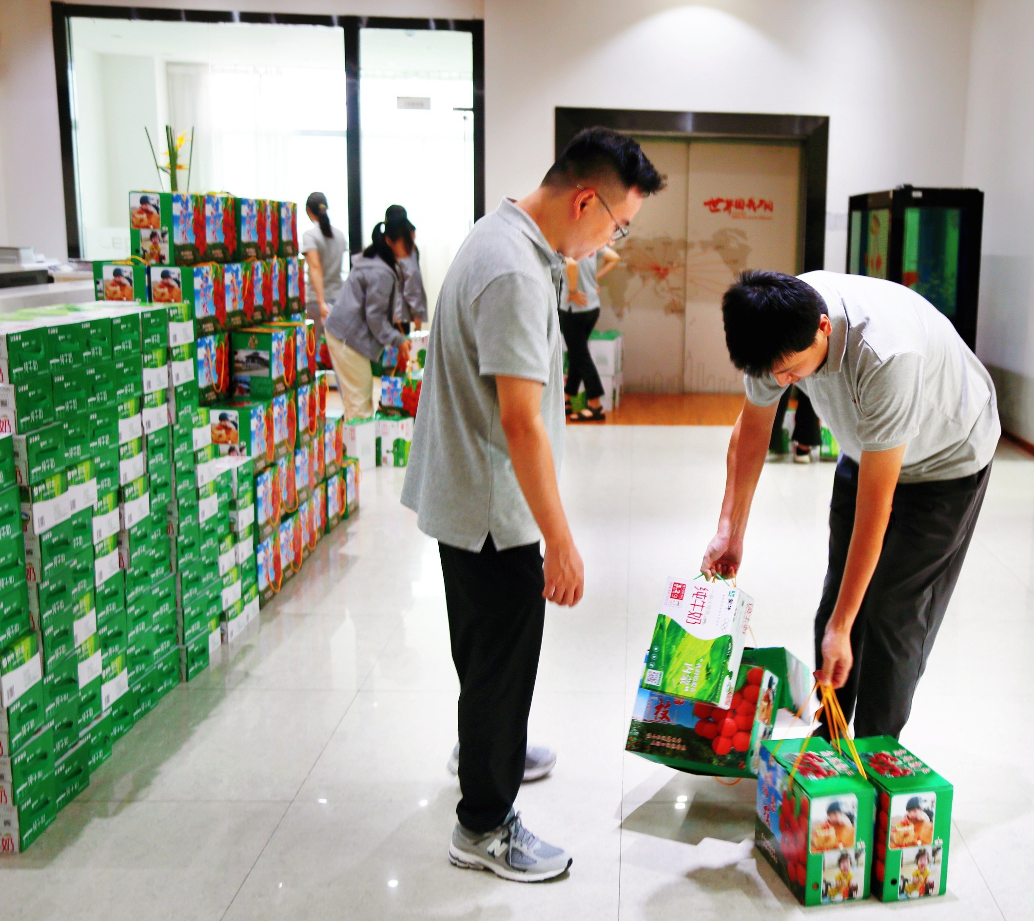 一箱箱鲜牛奶和一盒盒新鲜的当季时令水果,"健康端午礼包"整齐摆放着,等着各部门来有序领取,员工们三两成群地结伴而来,有派部门代表前来领取的,大家脸上都洋溢着期待与喜悦的神情。