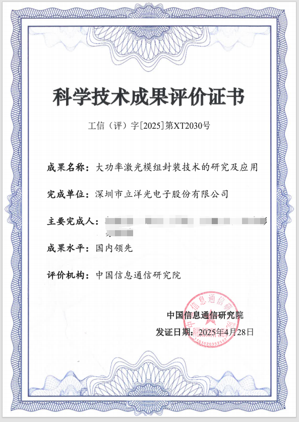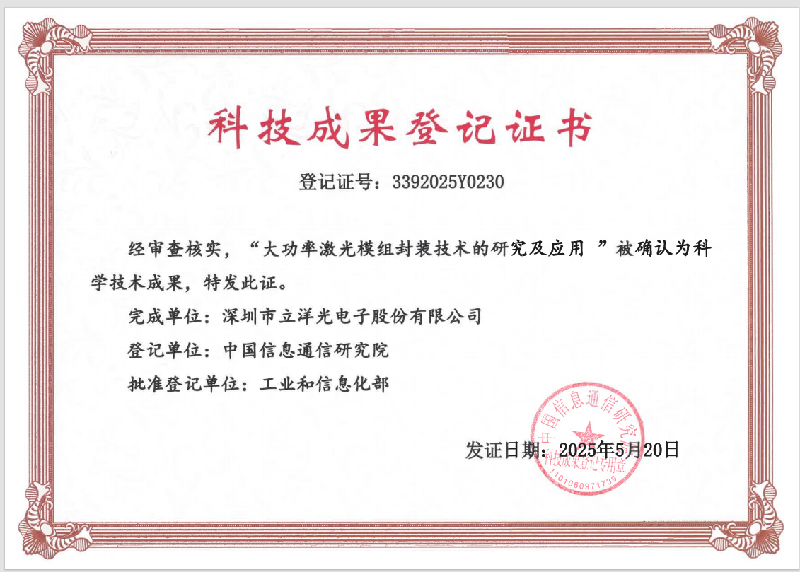 喜报 I 立洋光电“大功率激光模组封装技术”荣膺国家工信部科技成果登记证书!