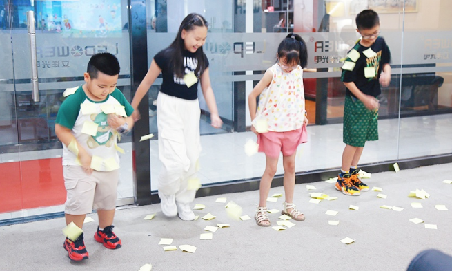 每位小朋友贴上便签纸,随着主持人的一声“321开始!”,大家立刻扭动身体、疯狂甩头,甚至跳起“抖臀舞”,试图甩掉背后的所有便签纸,现场一片“噼里啪啦”的撕纸声和欢笑声,游戏PK下来,最终由“立洋活力王者”小组获得奖品,并合影留念。