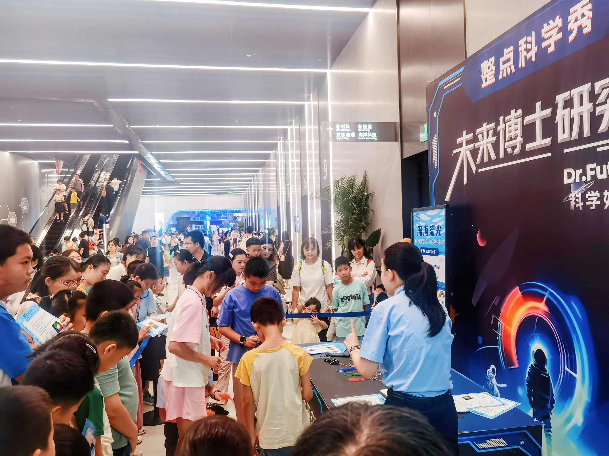 二层中庭上演的一场融合科技与奇幻的沉浸式科学秀「未来博士实验室」,吸引了好多小朋友,这场由“怪博士”主持的互动表演,以“未来科技危机”为背景,通过泡泡、空气炮等道具,将抽象科学原理转化为可触摸的感官体验。