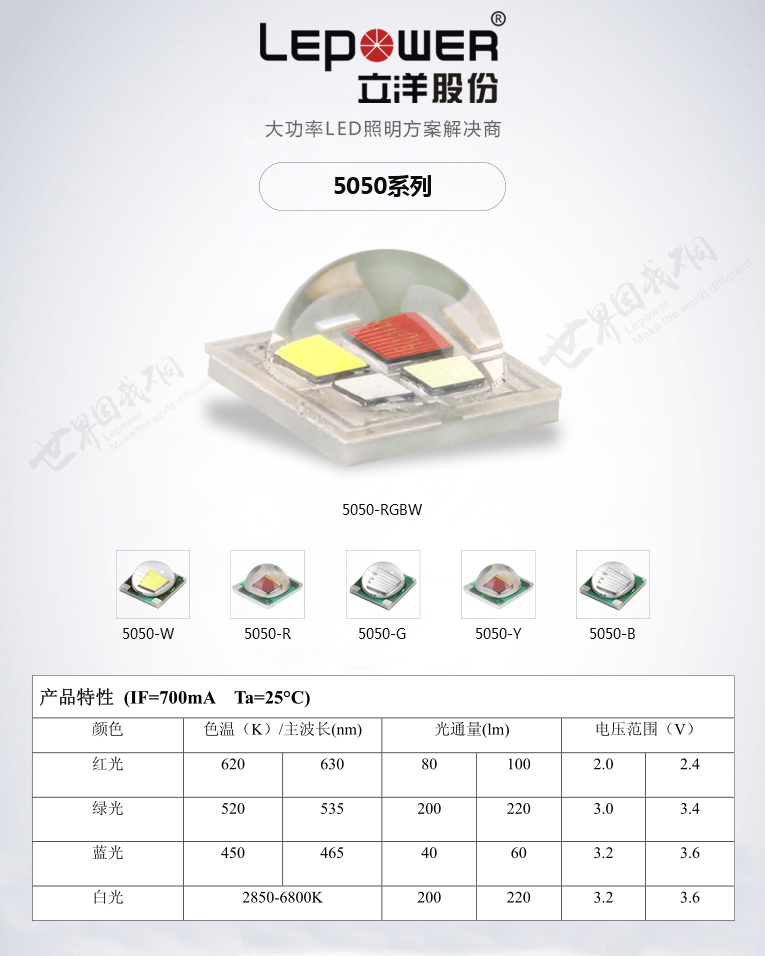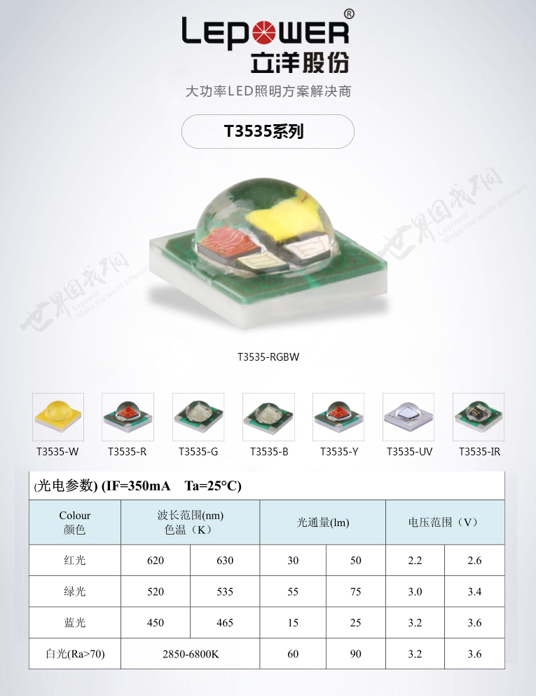 为了满足城市夜景照明对光源需求,立洋股份重磅推出陶瓷5050系列、陶瓷3535系列亮化光源,这两系列光源涵盖四晶合一RGBW,三晶合一RGB以及单晶亮化光源。四晶合一RGBW为红光(620-630nm)、绿光(520-530nm)、蓝光(450-460nm)、白光全色温(3000-8000K)组成,采用陶瓷热电分离结构,稳定性高;分光分色,光斑均匀,光线柔和舒适;同时,具有可控色功能,可根据不同场景的照明需求来设定。