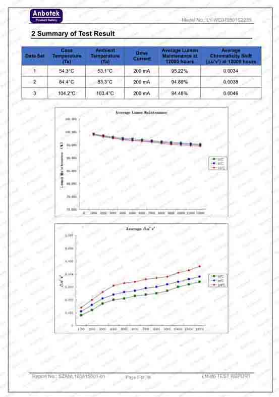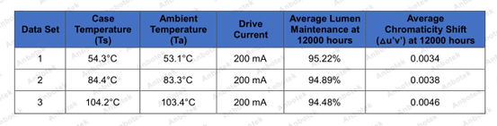 本次测试,立洋股份5050产品12000小时流明维持率分别为:54.3℃12000小时高达95.22%、84.4℃12000小时高达94.89%、104.2℃12000小时高达94.48%,由此可见立洋股份5050产品的超低光衰。依据TM-21寿命推算方法,在200mA驱动电流下,55℃、85℃、105℃这三组预设温度推算L70寿命分别为115000小时、115000小时、101000小时,此测试结果表明立洋股份5050产品具有良好的使用寿命。