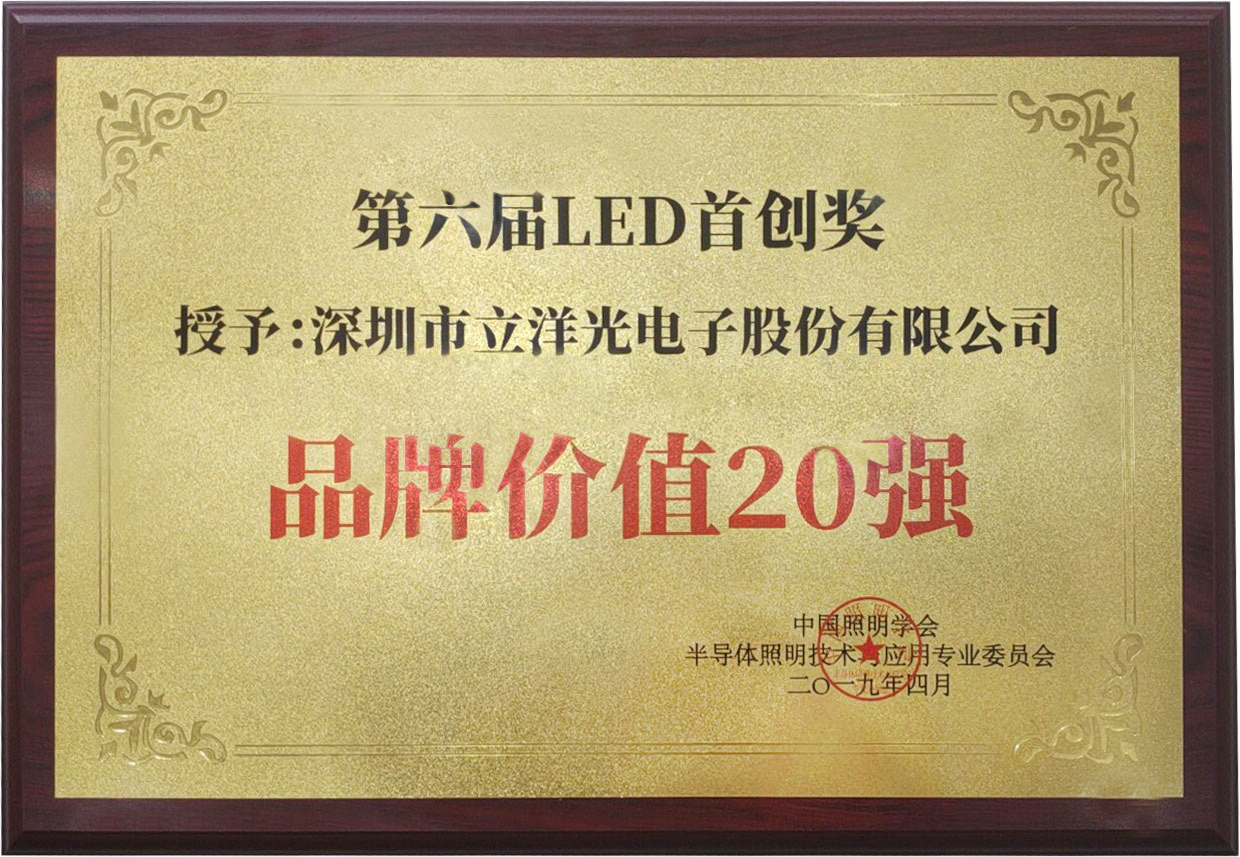 中国LED首创奖“品牌价值20强”,是目前中国LED品牌价值最权威的排行榜之一,其评估主要以企业的营收规模、品牌领导力、产品及服务质量优势、社会责任为测算指标,结合企业的成长年限、科研投入、创新成果、品牌投入、品牌活跃度、用户口碑等各种评价指标而测算出来的。