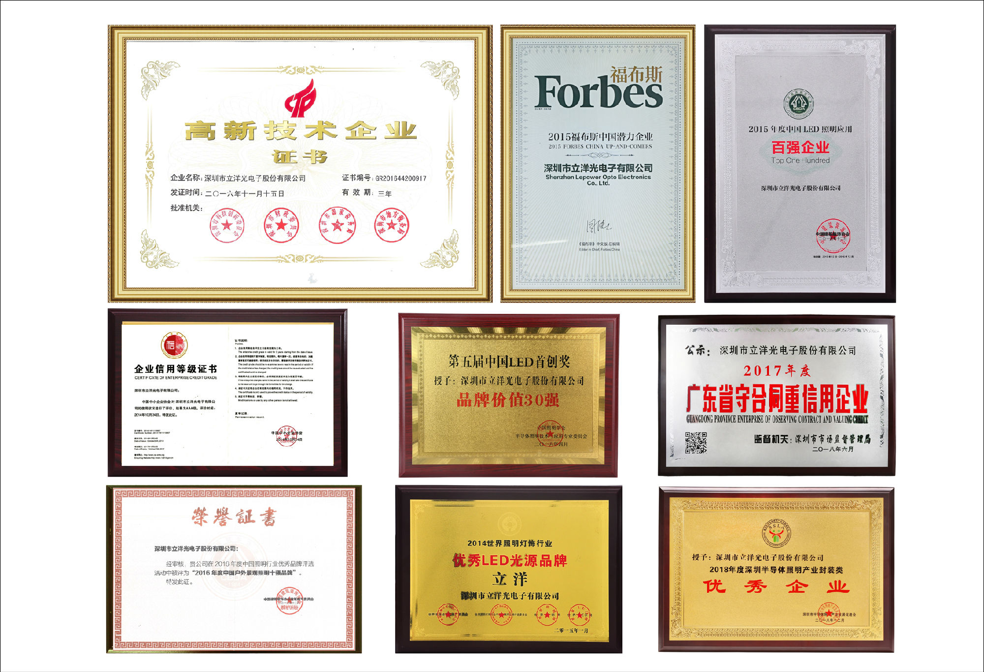 自成立以来,立洋股份始终坚持技术创新驱动战略,专注研发,打造精品,建立以企业为主体、市场为导向、产学研相结合的技术创新体系,为各种不同的LED照明应用提供全方位解决方案。经过十多年的努力耕耘,立洋股份取得了累累硕果,先后获得国家级高新技术企业、中国企业信用AAA级、中国LED照明应用百强企业、2015福布斯中国非上市潜力企业百强、广东省守合同重信用企业、中国LED首创奖中国LED新三板30强,2016、2017年度中国LED行业最具投资价值企业,2018年深圳半导体照明产业封装类优秀企业等荣誉。