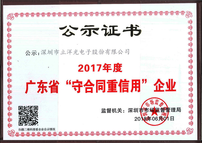 热烈祝贺立洋股份获得“2017年广东省守合同重信用企业”荣誉称号