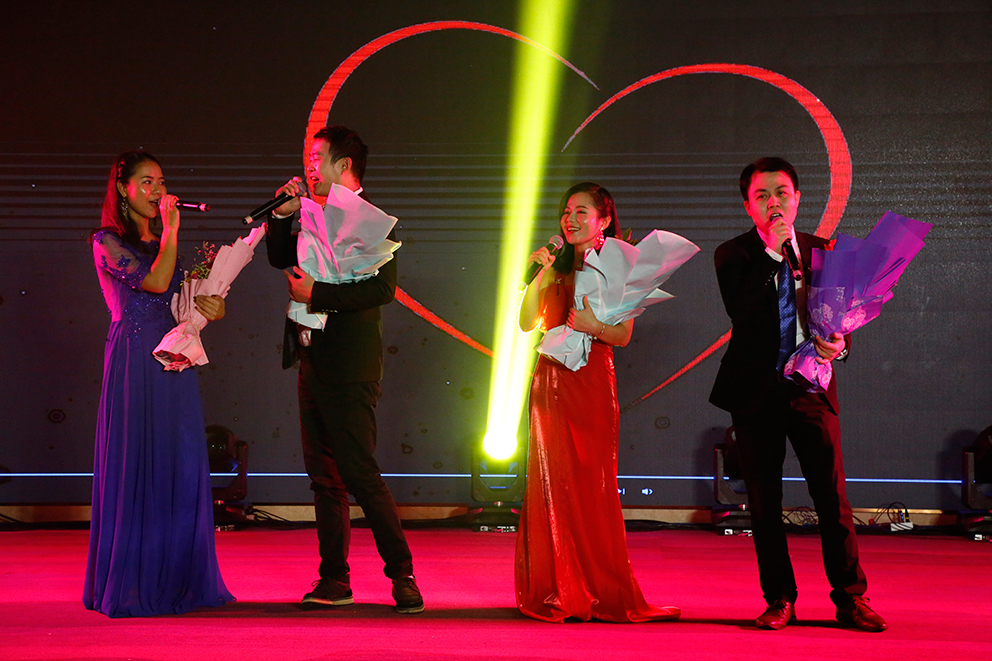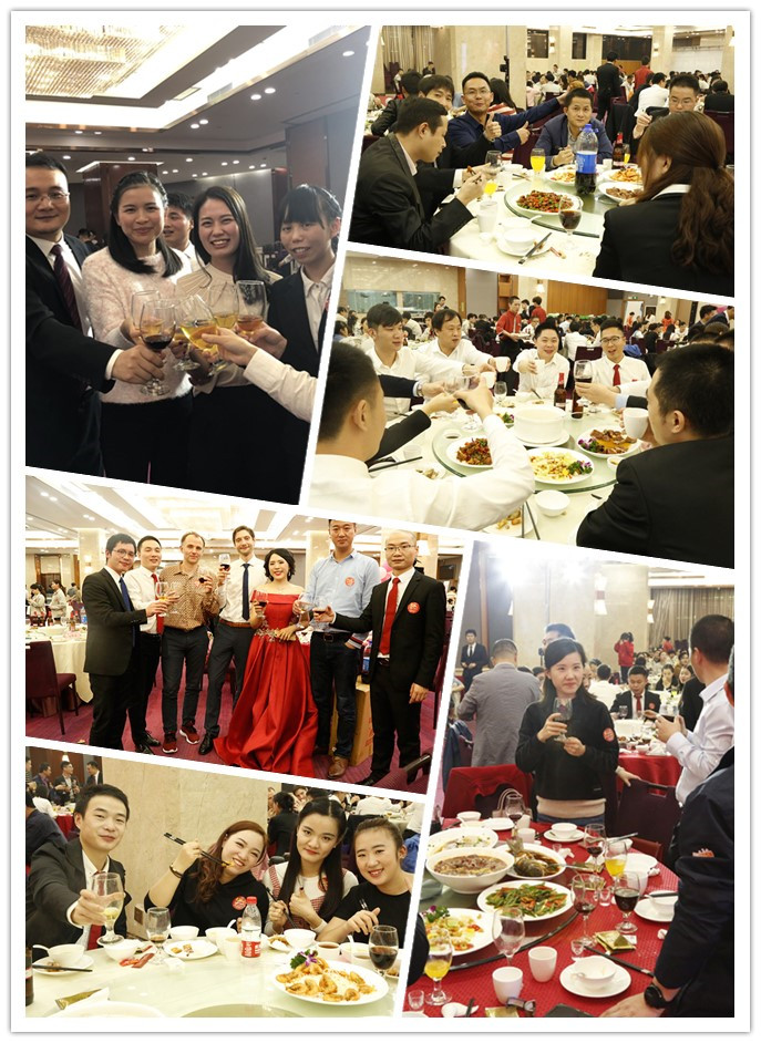 节目汇演完,进入晚宴环节。立洋股份总经理秦胜妍女士上台致祝酒辞后,公司诸位高管一同上台共注香槟塔进行祝酒,答谢晚宴正式开始。