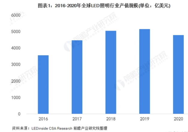 统计数据表明,在全球各国节能环保政策的帮扶下,近几年来全球LED照明市场总体保持约10%的增速快速增长。但到了2020年,由于受到新冠疫情的影响,行业产值出现一定程度的下降,据前瞻产业研究院测算,2020年全球LED照明行业产值约4500亿美元。