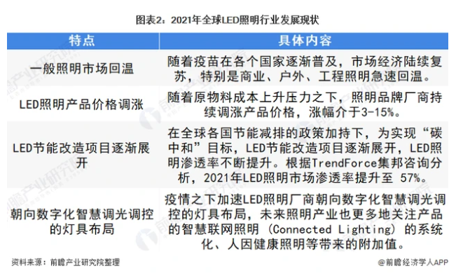 随着2020年疫情的逐步控制,商业、户外、工程照明急速回温。同时根据TrendForce调研结果显示,LED照明向其他行业的渗透率大幅提升。此外,LED行业还呈现出LED照明产品价格调涨及朝向数字化智慧调光调控发展的特点。