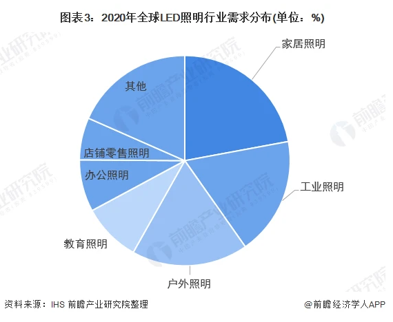 从全球LED照明行业需求占比来看,家居照明超过20%,应用最广,其次是工业和户外照明,均在18%左右。