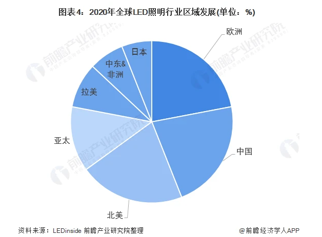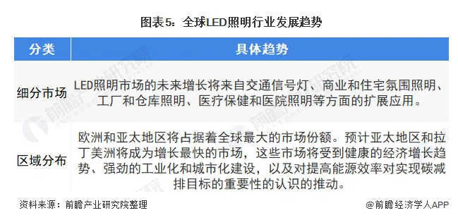 从全球LED照明行业发展趋势来看,全球照明LED总体有所回升,渗透率有所提高,从细分市场来看,户外、商业风照明的拓展应用是LED照明市场新的增长点;从区域分布来看,欧洲和亚太地区在短时间内依然占据全球最大的市场份额。