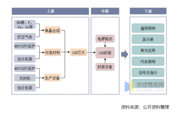 LED照明产业链较长,不同环节分工明确。上游主要包括单晶合成、衬底制作、芯片制作以及生产设备供应四个环节;中游为LED的封装环节;下游主要应用于通用照明、显示屏、背光应用、汽车照明、信号指示等领域。