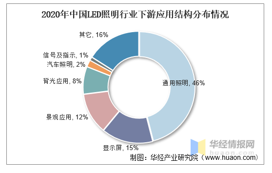 从LED照明应用结构情况来看,通用照明是LED照明行业最大的应用领域,2020年市场占比达46%,其次为显示屏和景观照明,占比分别为15%和12%。