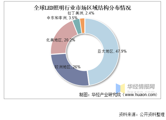 从市场区域分布情况来看,由于亚太、欧洲和北美等地区作为世界主要经济体,消费能力强,市场需求旺盛,占据了全球LED照明行业绝大部分的市场。其中亚太地区是全球最大的LED照明消费市场,占比达47.9%,其次为欧洲和北美地区,占比分别为26%和20.2%。