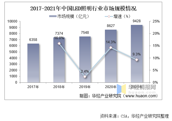 我国作为LED照明产品最大的生产制造国,近年来产业规模迅速发展,加上在白炽灯替换需求的加持下,LED照明产品渗透率不断提升,为行业规模的增长提供了强劲动力。据资料显示,2021年我国LED照明行业市场规模达9428亿元,同比增长9.3%。