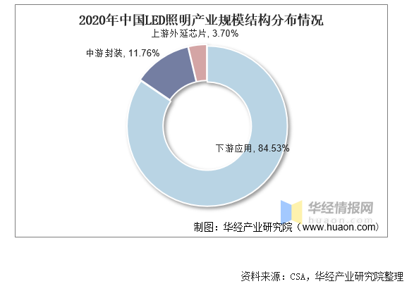从产业规模结构情况来看,2020年我国LED照明产业规模中,下游应用占比达84.53%,中游封装占比为11.76%,上游外延芯片占比为3.7%。