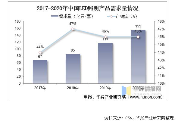 从需求量情况来看,近年来我国LED照明产品需求量呈上升趋势。据资料显示,2020年我国LED照明产品需求量达155亿只/套,同比增长32.5%,产销量为46%。
