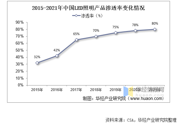 随着我国LED照明行业的快速发展,在下游需求增长的带动下,行业渗透率也随之不断提升。据资料显示,2021年我国LED照明产品渗透率达80%,较上年增长2%。