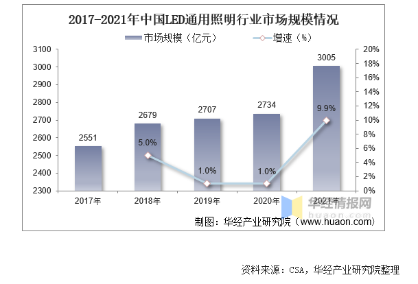 LED通用照明应用是LED照明应用市场的第一驱动力,由于LED照明技术发展迅速,以及成本快速下降,已成为全球主流照明光源。近年来,通过将智能控制模块嵌入LED通用照明终端,形成了具有自动控制、系统化控制等功能的智能照明创新领域,已成为LED通用照明市场的新增长点。据资料显示,2021年我国LED通用照明市场规模达3005亿元,同比增长9.9%。