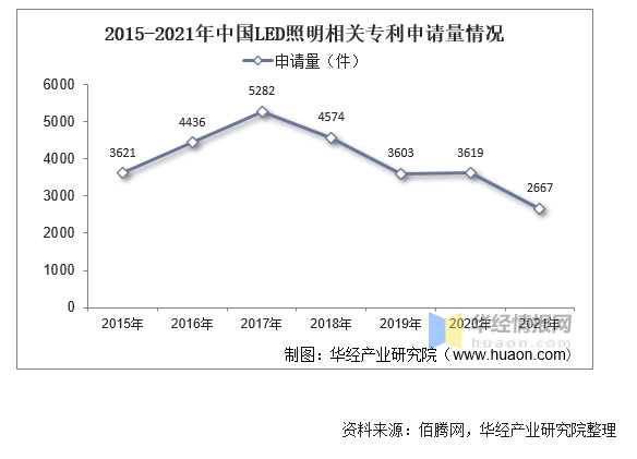 从行业专利技术情况来看,随着行业的快速发展,我国LED照明相关专利申请数量不断增长,到2017年达到峰值,为5230件。随着行业技术迭代放缓,行业相关专利申请数量也随之下降。到2021年我国LED照明相关专利申请数下降至2667件。