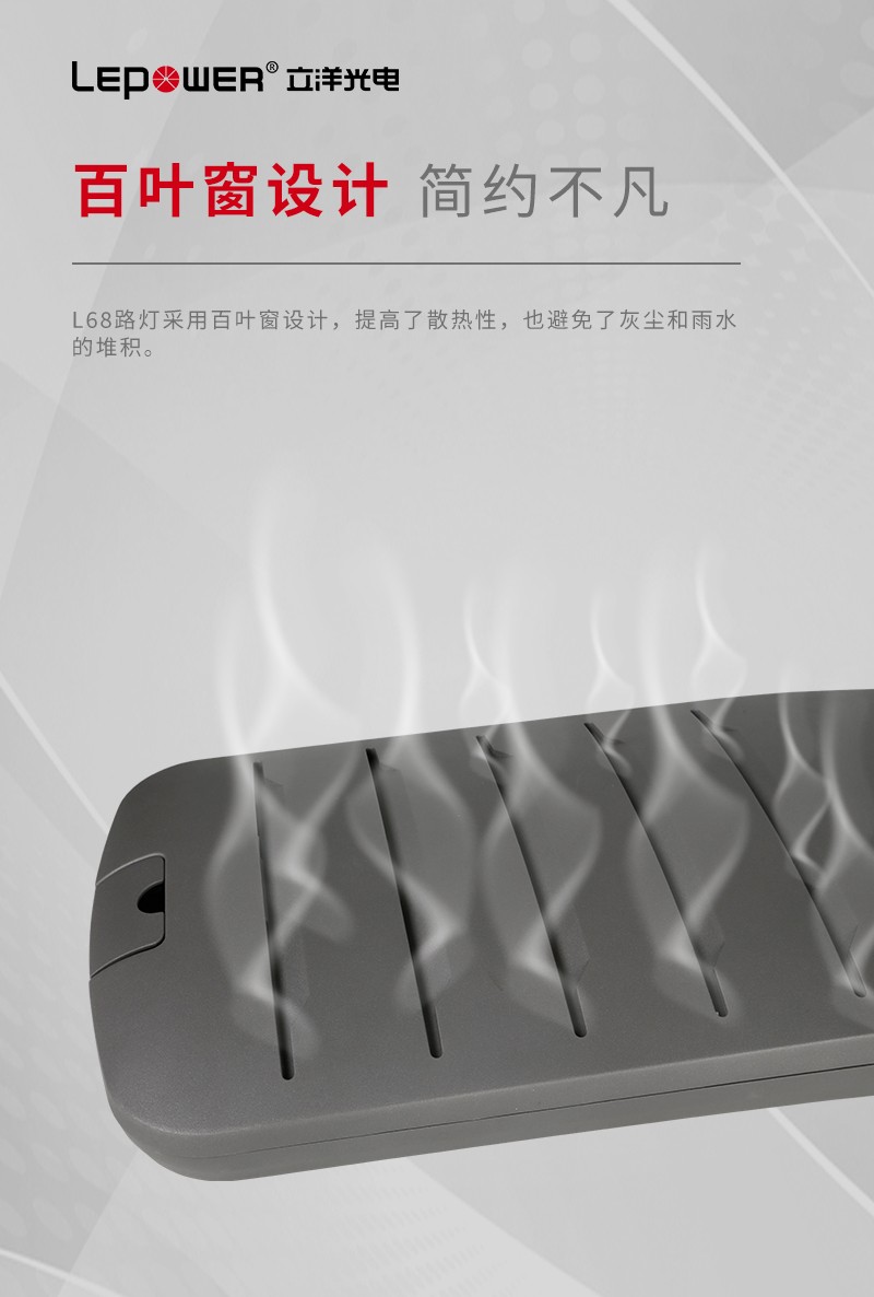 L68LED路灯采用百叶窗设计,提高了散热性,也避免了灰尘和雨水的堆积。