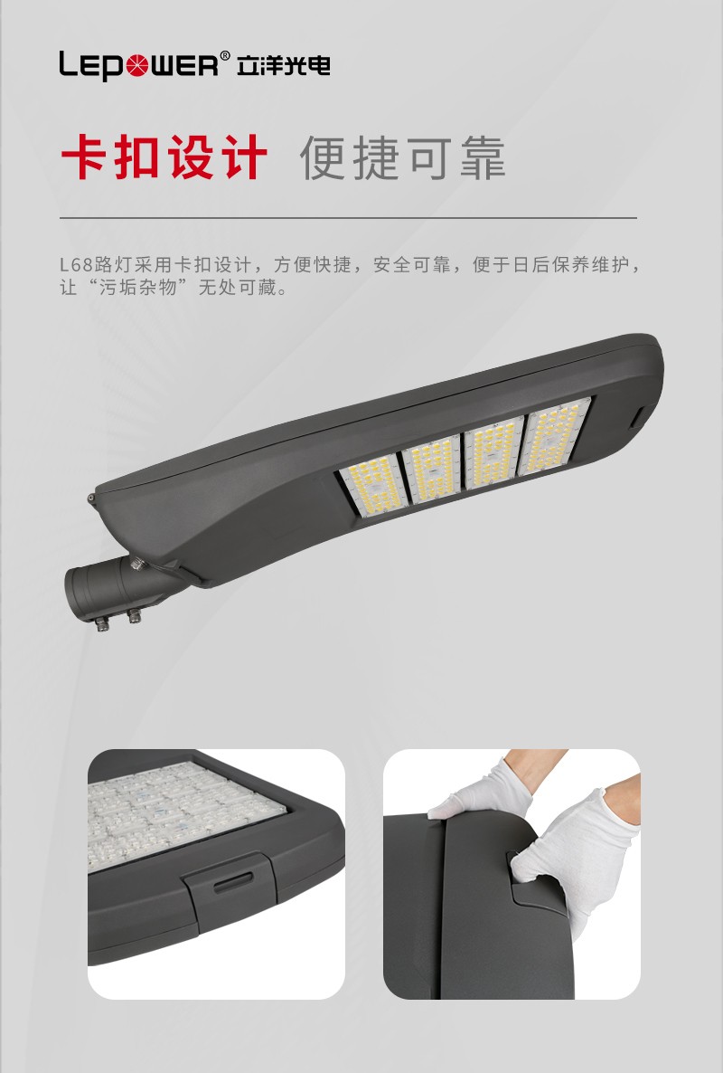L68LED路灯采用卡扣设计,方便快捷,安全可靠,便于日后保养维护,让“污垢杂物”无处可藏。