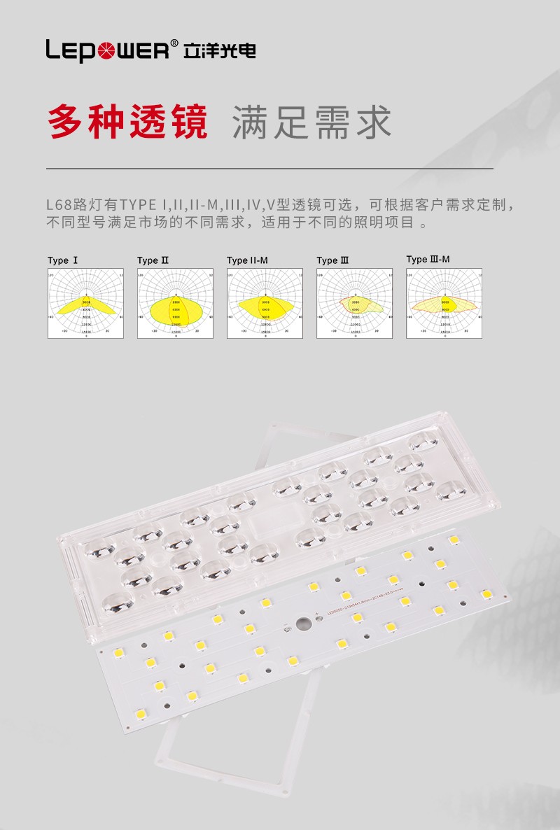 L68LED路灯有Type I,II,II-M,III,IV,V型透镜可选,可根据客户需求定制,不同型号满足市场的不同需求,适用于不同的照明项目。