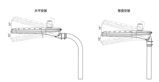 L68 LED路灯的安装角度范围在-10°~ 15°角度可调,适用于不同安装臂。