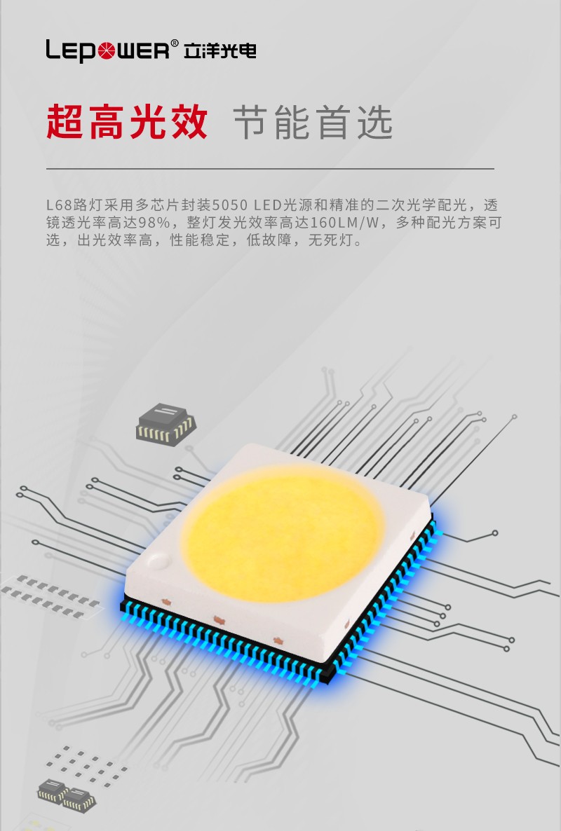 L68LED路灯采用多芯片封装5050 LED光源和精准的二次光学配光,透镜透光率高达98%,整灯发光效率高达160lm/w,多种配光方案可选,出光效率高,性能稳定,低故障,无死灯。