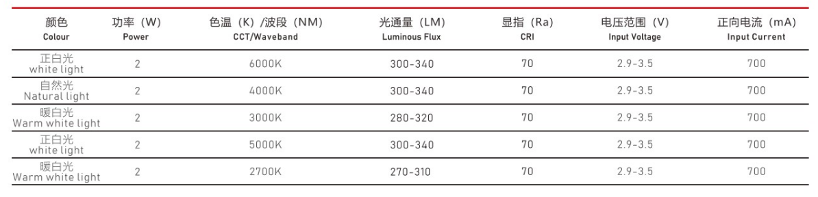 手电筒光源T5050-W灯珠颜色有正白光自然光暖白光三个不同的颜色,色温(K)/波段(NM)范围在2700K-6000K区间,光通量 (LM)270-340,显指RA是70,电压范围范围在2.9V-3.5V,正电流是700mA,尺寸:5.0×5.0×3mm,非常适合用在手电筒领域。